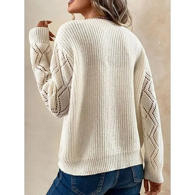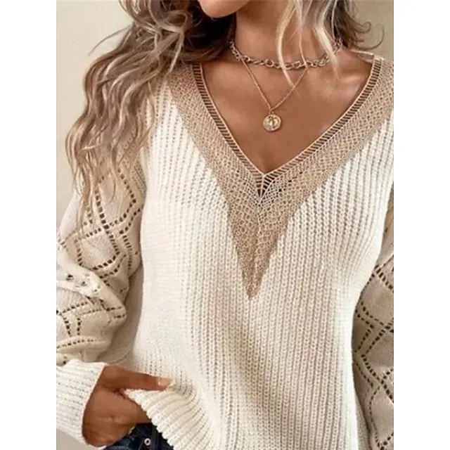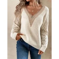 Women’s Pullover Sweater Jumper V Neck Ribbed Knit Acrylic Lace Trims Fall Winter Daily Going out Weekend Stylish Casual Soft Long Sleeve Solid Color Black White Green S M L